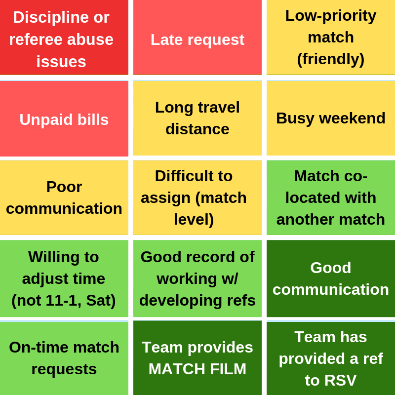 The chart below shows the matrix the Scheduler uses to assign referees to your match. Feel free to find ways to improve the likelihood that the RSV will be able to provide a referee for you.